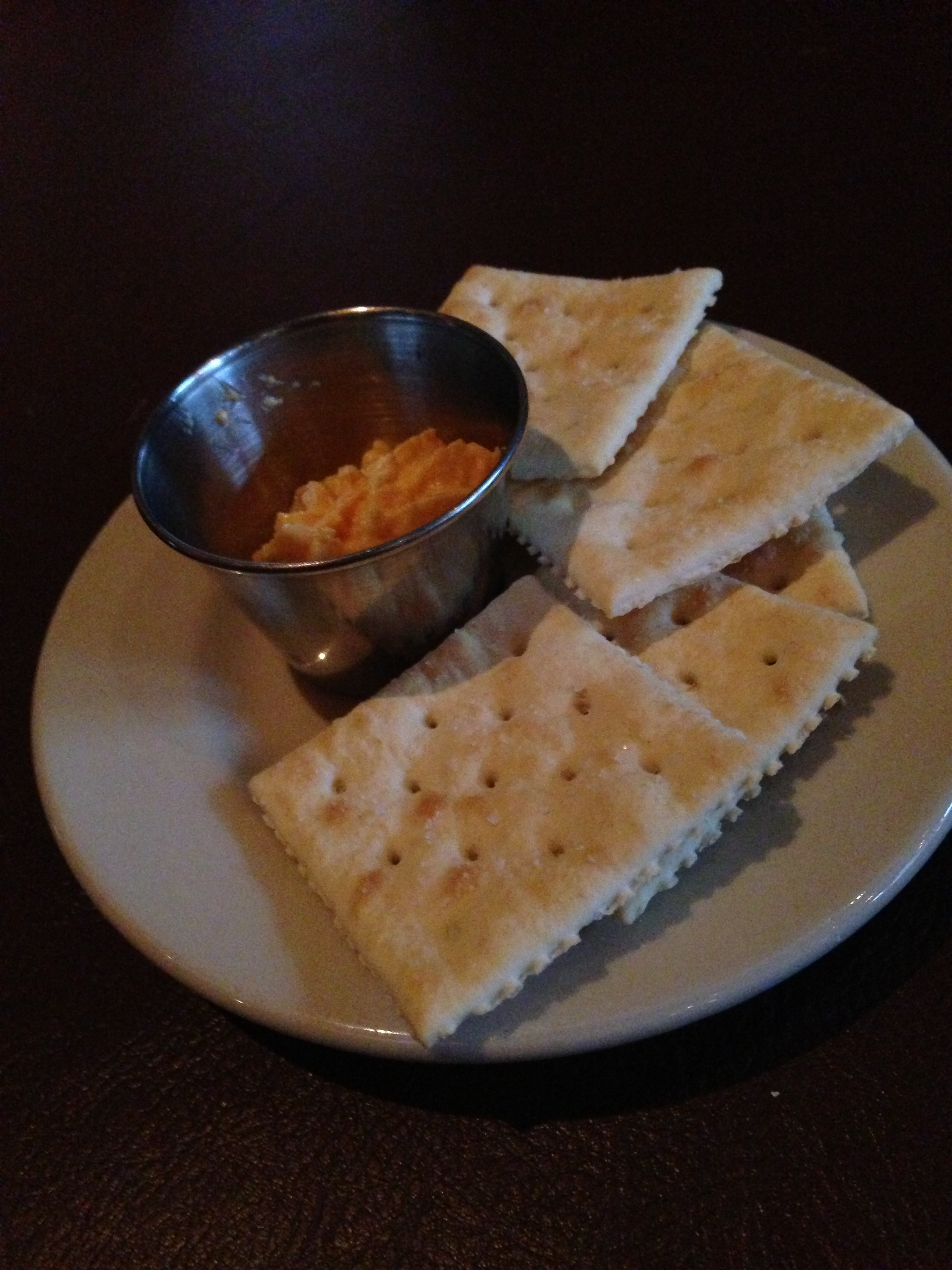 The mac-and-cheese and deviled eggs arrived first. The deviled eggs were classic deviled eggs. No dill (like Village Whiskey), no fancy add-ins (like Supper) – just eggs, mayo, and paprika. If there was anything else, my feeble palate missed it. They were quite good! Classic. I’m not sure how they got the filling to be so light and fluffy – but it was like an egg yolk cloud in my mouth. The mac-and-cheese came bubbling in a hot dish covered with nicely-toasted breadcrumbs. It was a nice, plain mac-and-cheese. Once again – no weird cheeses, nothing added to it – just mac … and cheese … It was also done well – the macaroni was a soft-but-not-mushy consistency, and the cheese was calm and smooth. kp and I wanted a little more flavor in the mac-and-cheese (maybe some sharper cheese), so kp requested his go-to fix-all, hot sauce. He was pleasantly surprised and satisfied with Percy Street’s selection of hot sauce: Crystal (apparently this is also the hot sauce that is used in the South). It perked up the mac-and-cheese nicely (although if I used as much as kp did, my mouth would still be burning).