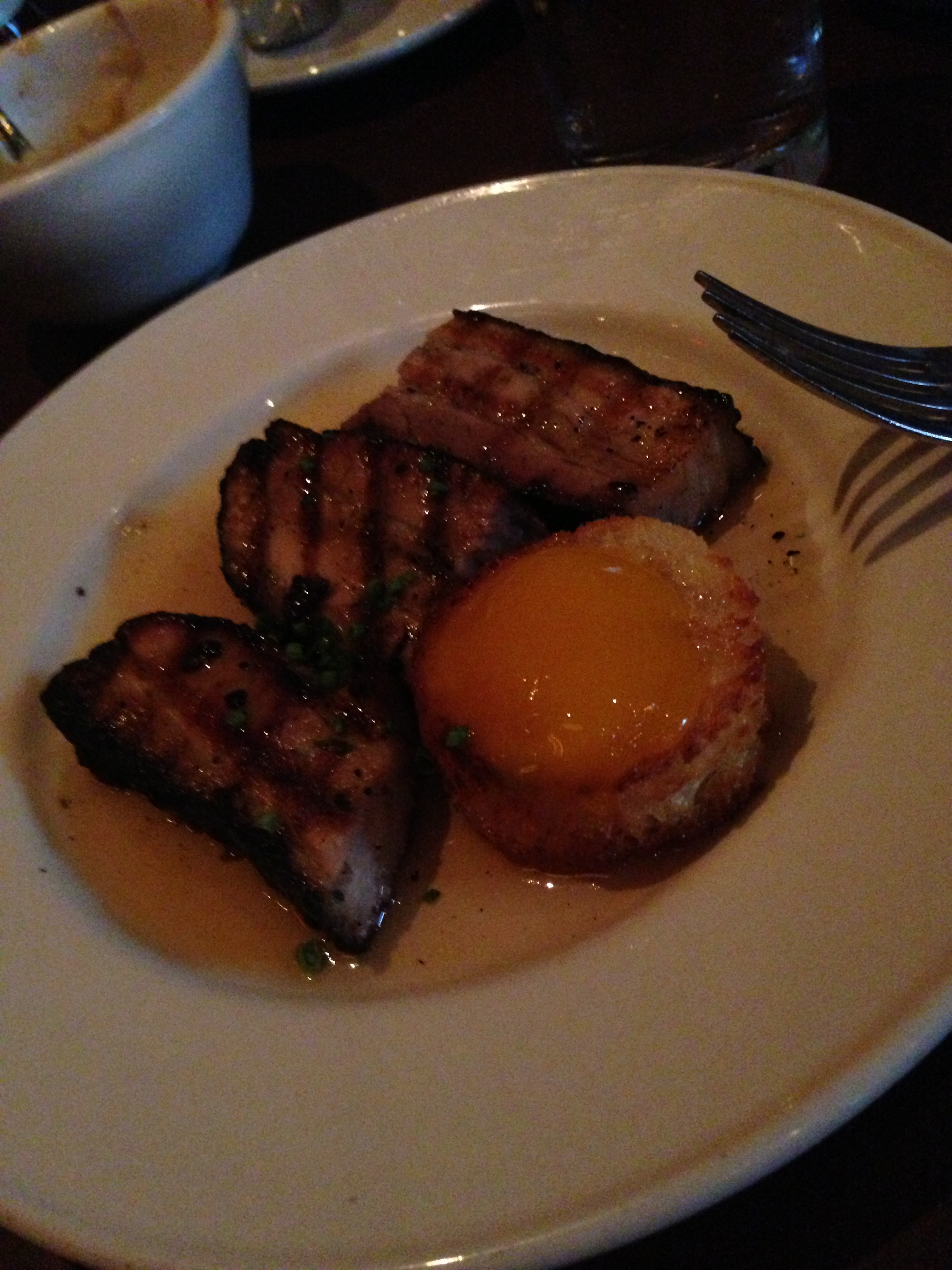 When the day began we actually found ourselves at Parc with even more friends! We’d gone there once before and, in preparation for our pig crawl, we exerted restraint in choosing our dishes. We opted for the pastry basket, a side of bacon, and a French75. That’s restraint, right? Starting off the day with some buttery pastries and fatty bacon chased by a bubbly cocktail? Sounded good to us! Plus, the bacon meant we were starting our pig crawl early! (which is actually why we ordered it). The pastry basket was delicious like the first time (although the chocolate croissant still had its rod of chocolate), and it included madelines! Sooo good. The bacon was only ok for me, as I like mine a bit thicker (and a little crispier), but the salty, smoky taste of it was quite nice, and, after all, who’s going to argue with bacon? The French75 was exactly as before, so g liked it a lot! Our friends sampled the pomme frites, pain perdu, the poached eggs, and the steak-and-eggs. By the end of the meal, not a single scrap of food remained, so I think it was a success. Good job, Parc. You might not be besting Cochon’s brunch, but you’re a good ol’-reliable.