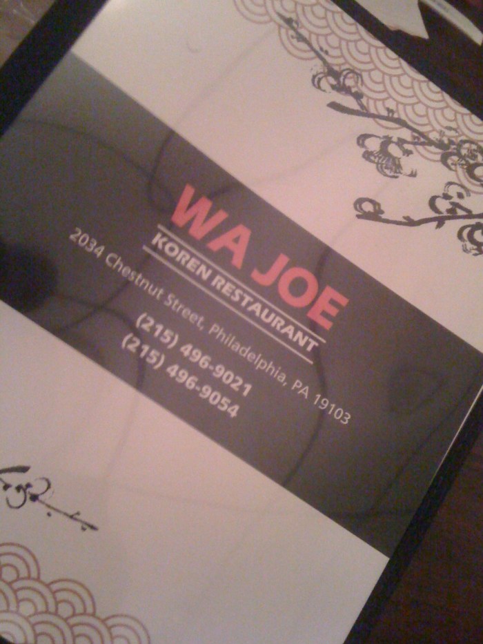 Wa Joe: On Chestnut was Korean restaurant called Miran. On one hand, g, dz, smn, and I were not that sad to see it go, as the previous manager was a tiny bit … curmudgeony. But the food was a notch above mediocre (i.e. “solid”) and reasonably priced! The four of us each enjoyed our dishes [despite the obvious reverse discrimination] so much so that we wanted to go back … except this time, it wasn’t called Miran anymore. It was called “Wa Joe”. It was opening week. It was game time … Props: Everything was nice and clean and sparkling new.