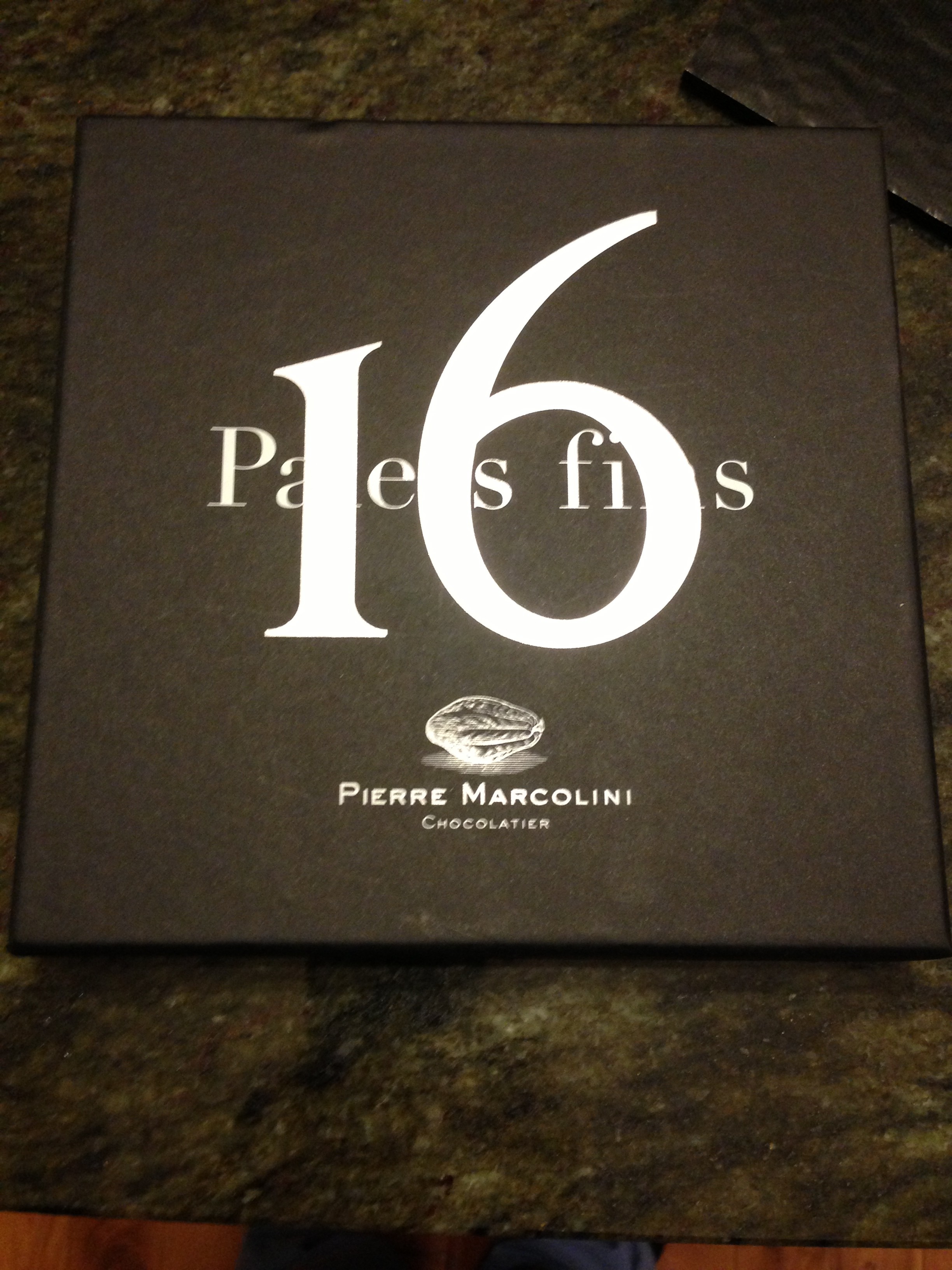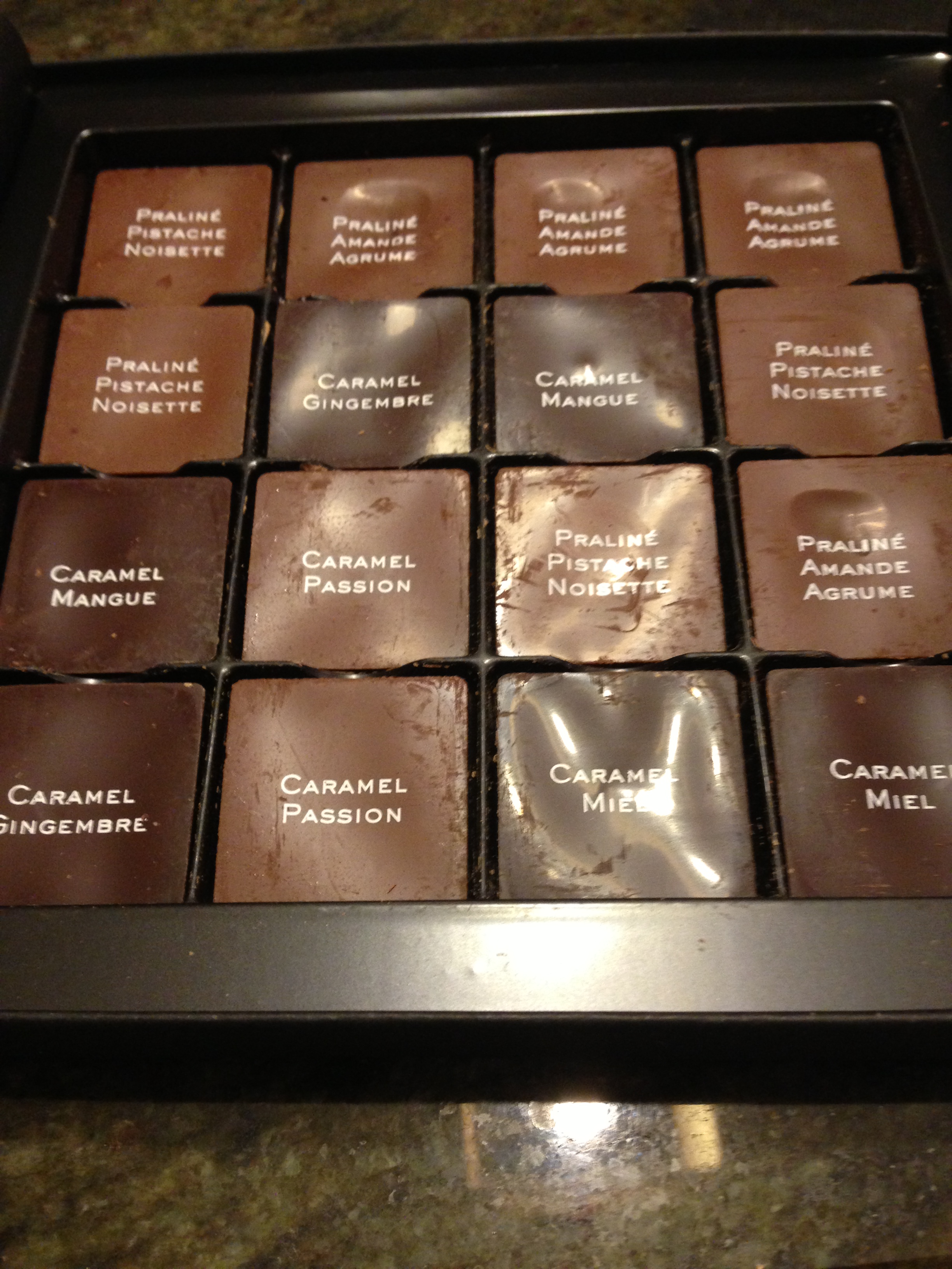 g liked how the chocolates, themselves, were labeled with what they tasted like – it was very cool. and the chocolates were great! they had just the right proportion of chocolate to filling (i.e. the imprinted flavors were just a thin layer so they didn’t overwhelm the chocolate so much as accent it). I think these’d be a great dinner party thing to have.