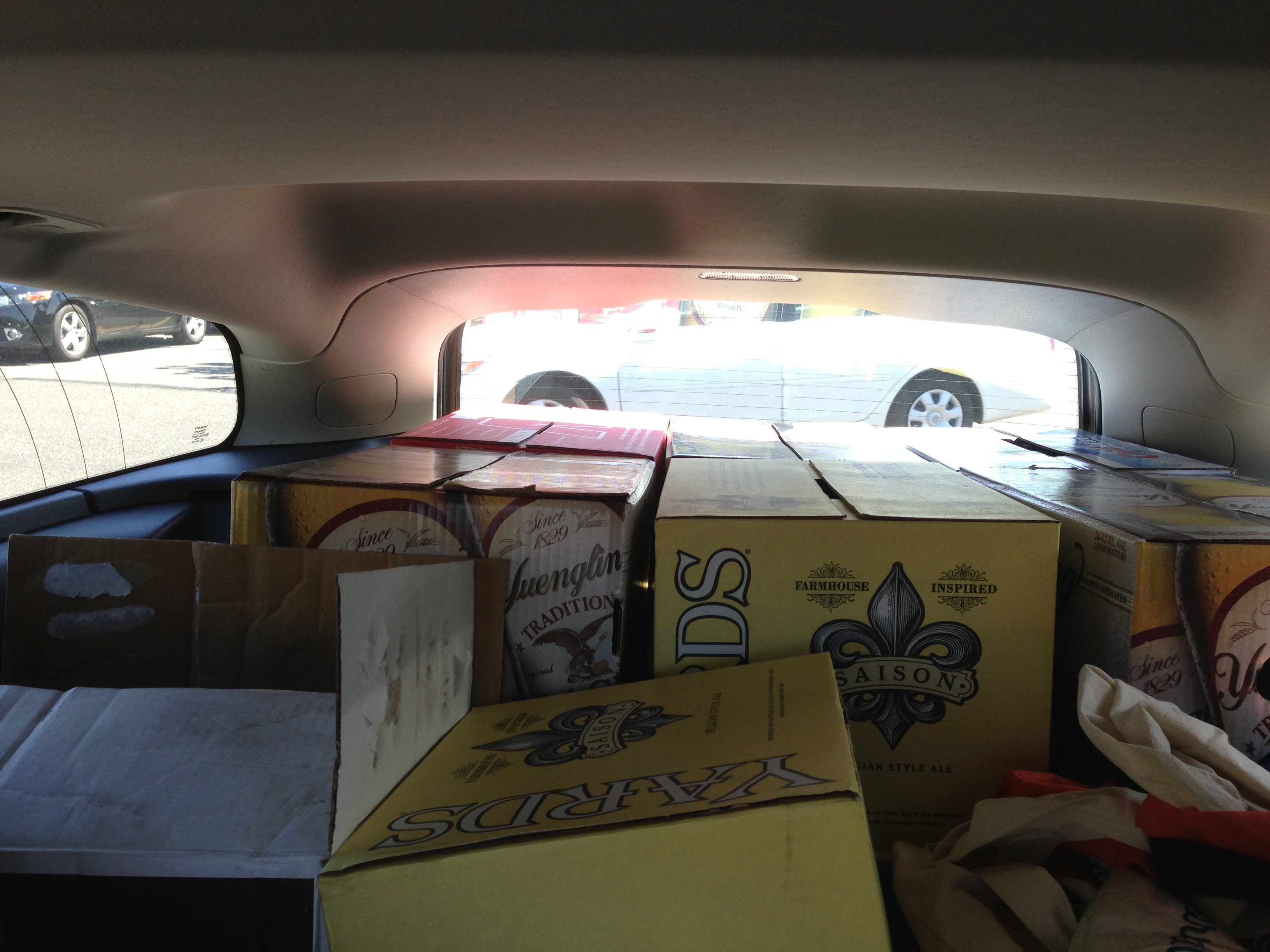 speaking of parties … well let’s just say that someone special is having their 80th birthday party pretty soon … and that person put g in charge of putting a and me in charge of acquiring EtOH for the party … so a and I went shopping this weekend for the party … Funny thing happened – with our combined infinite wisdoms, neither of us stopped to think about how much we could actually transport in the car when we made our purchases – we just stopped buying things when we felt like we had “enough” … and we come out to my tiny clown car (our adorable volvo C30 named FiFi) and panic strikes us – was it all going to fit? Well, as you can see, it did! But we literally could not fit a single other case of beer or wine in the car (a did have to hold a case on his lap). Crisis averted! Now that I have scrutinized the layout, I suspect that with some reorganization of with putting some cases on their side, I may have found another way to fit at least 2 more cases back there … next time! And when we come back from hiatus, I’m sure we’ll have updates as to how the party went.