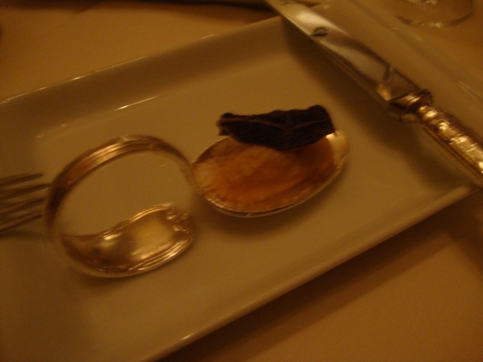 Next we were served two different pastas. One was a saffron pasta stuffed with braised squab and hand shaped into tortellini then served with a savory cocoa sauce. This was cm’s favorite from the whole night. I loved the stuffed pappardelle. It was long strips of tender home made pasta stuffed with cheese and matched with caramelized onions and topped with shaved foie gras. I had never eaten foie gras before, and I feel like I can still claim that. This was literally shavings from a big block, much as like some sprinkled parmesan cheese, and once it melted in I couldn’t taste it at all. The flavors in this pasta were very similar to the sweet onion crepe. Frankly, I didn’t care because they were both so freakin’ delicious I liked having it in two forms during the meal. In both pasta dishes the texture of the pasta was absolutely perfect, and cm wished he could have a whole bowl of it.