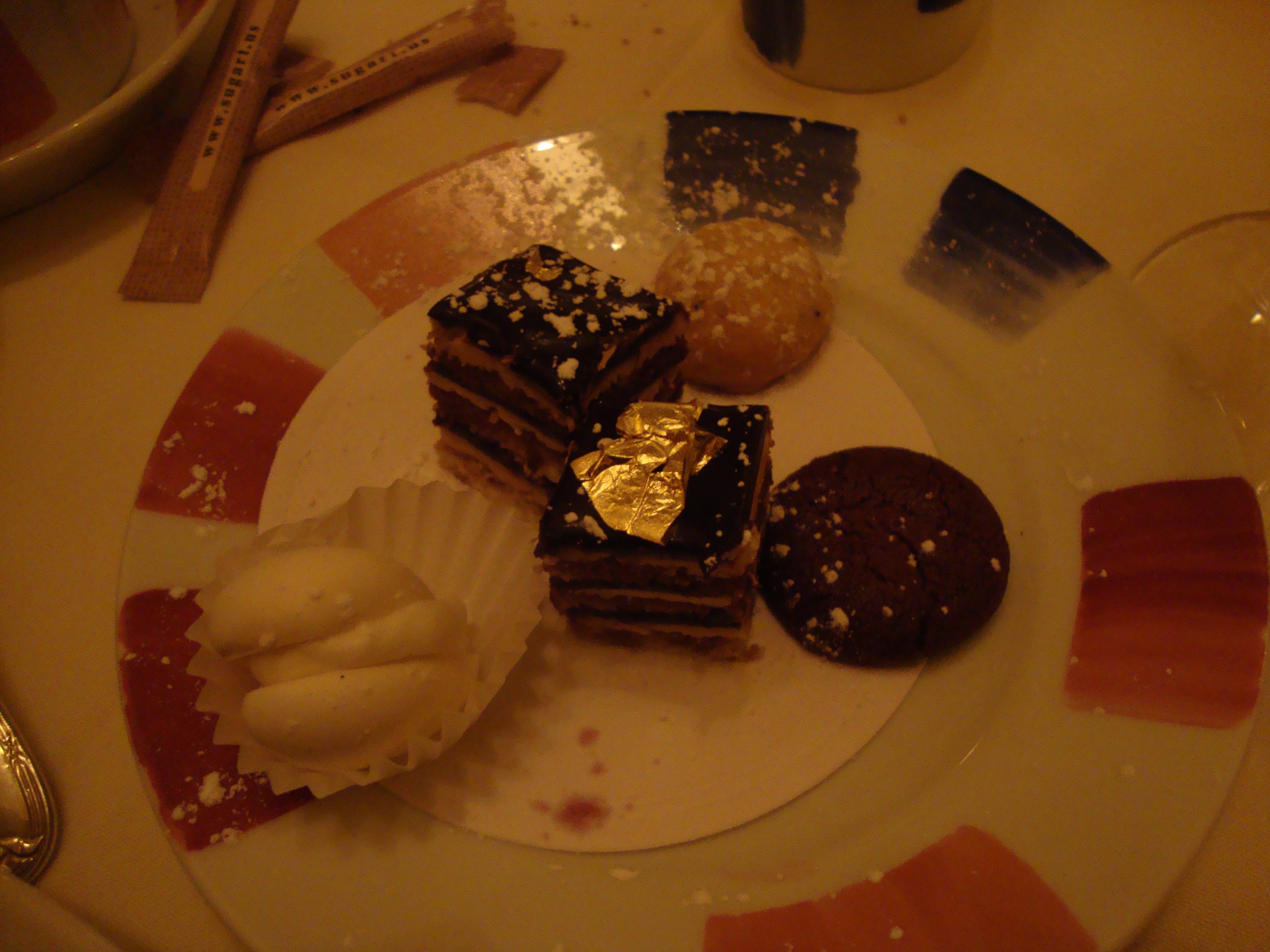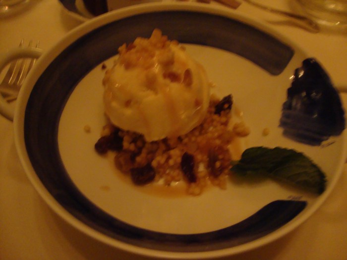 For the meat, we were served poached cod with a side of mushrooms. This was cm’s other favorite. The fish was light and buttery and kind of understated flavors. I agreed but thought it was over salted. Next we were served these little shot glasses of Concord grape sorbet. The texture was so smooth and creamy, not the usual icy feel you expect. As cm put it, it was more grapey than grapes. It was seriously grapey, and the perfect palate cleanser before dessert. Then came the craziest most creative dessert we’ve ever eaten. Israeli couscous, nuts, raisins in a light vanilla sauce served with ginger ice cream. As I mentioned, I never would have ordered this myself, but I was so glad we tried it! The Israeli couscous is plumper than the conventional one, with a great nutty flavor and feels almost like eating the pearls in bubble tea. The second dessert was a pistachio flan with a rich chocolate sauce and molten pistachio stuff flowing from the middle. This was followed by a plate of bite-size desserts. One was a deliciously light meringue with a vanilla coconut flavor. There was also a miniature chocolate mousse layer cake that was very tasty.