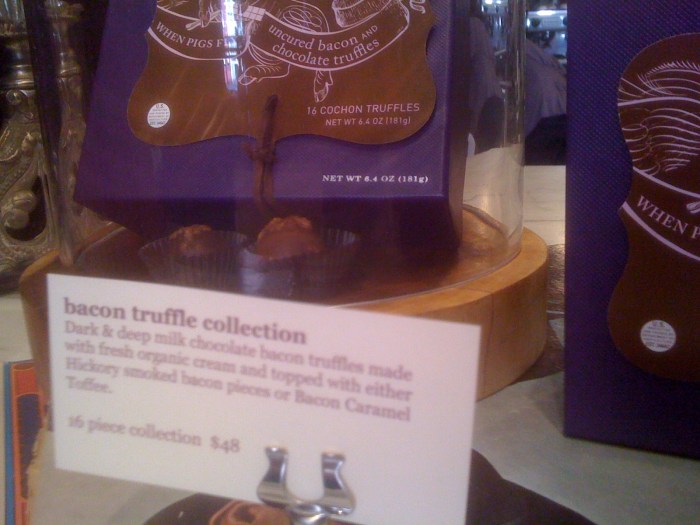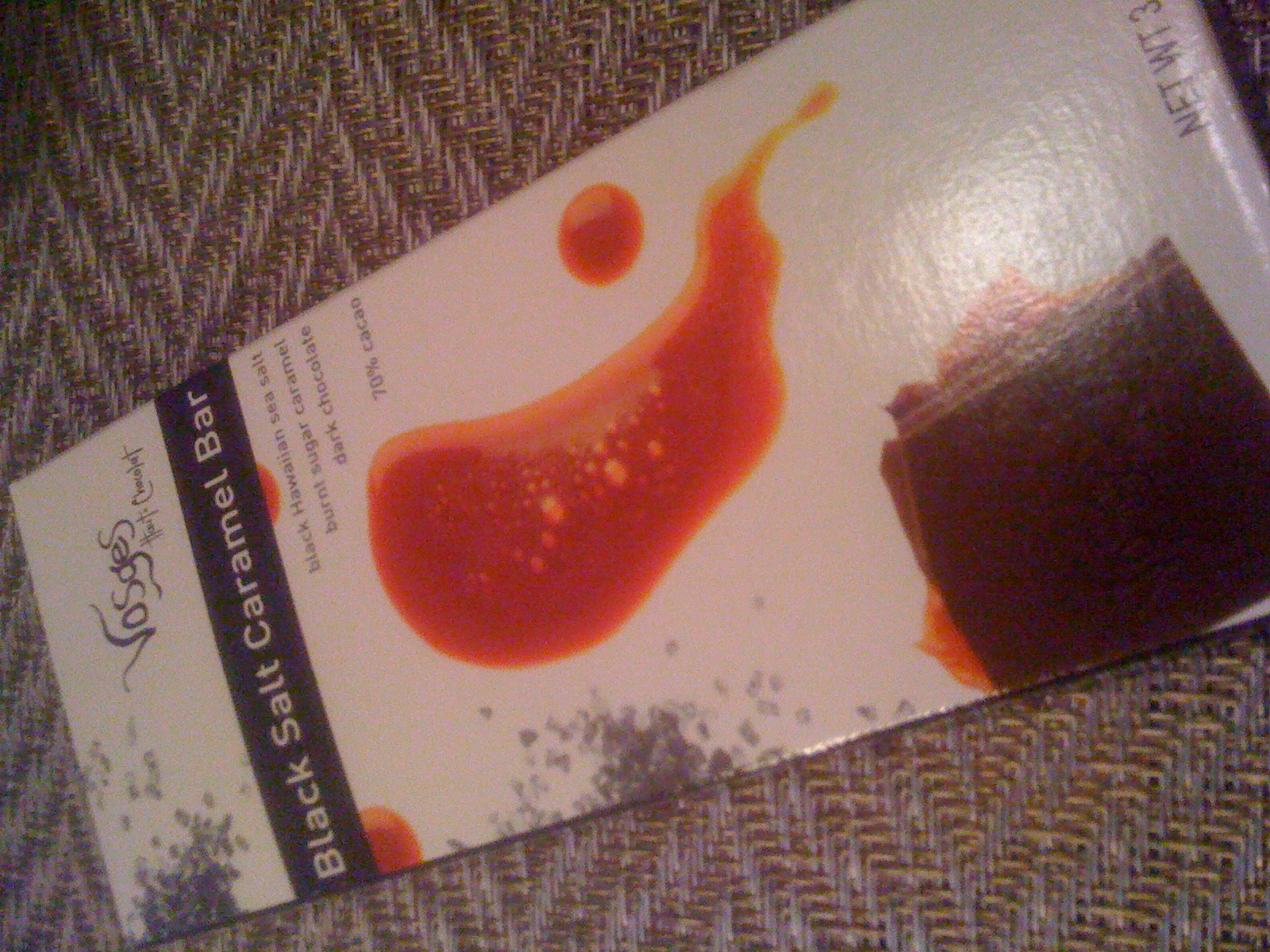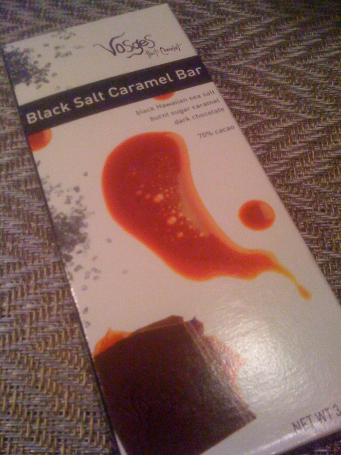 One day a month or so ago, lc sent us some Vosges chocolate, which was flavored with bacon. She thought we’d get a kick out of the concept. I did! My response was “ooooooo, bbaaccoonn …”. But g’s was, “oooooo, Vvoossggeess …”. I had never heard of Vosges, aside from the mountains. g tells me it’s some really nice, really expensive chocolate. I took her word for it. I imagine real choco-philes would probably snub Vosges (much like they snub Max Brenner), instead preferring some kind of chocolate that was had from a certain cocoa plant that was fertilized with a certain type of manure from a sacred cow that fed on a blessed field of grass. Whatever. I was going to judge for myself just how “good” these chocolates were; would they fulfill the ultimate criteria: would I buy it again?
